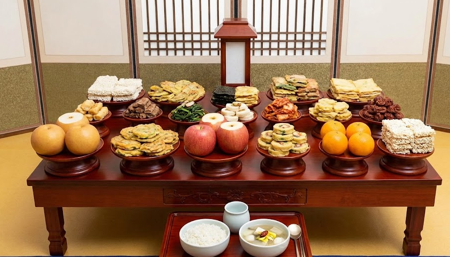- 5열 (디저트): 대추, 밤, 배, 감 순서 (홍동백서: 붉은 과일은 동쪽, 흰 과일은 서쪽)